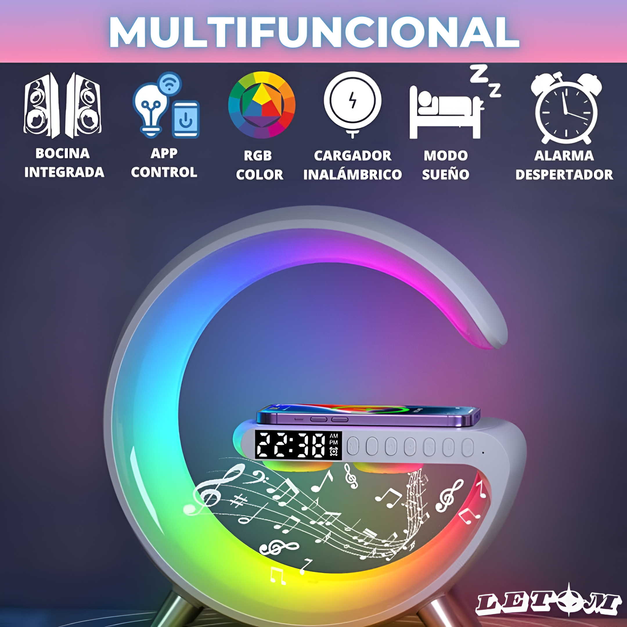 Vas a poder escuchar música, cargar tu celular, atender llamadas, programar alarmas y disfrutar de una hermosa ilumunación. Glow Hub® lo tiene todo.